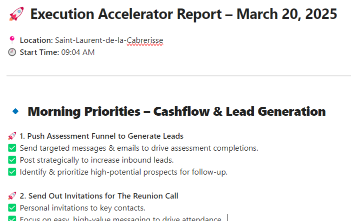 Every morning (or whenever I feel ungrounded) I run a quick ritual I call the Execution Accelerator Report. It’s not a productivity list. It’s a real-time mirror of where I am and what matters most.